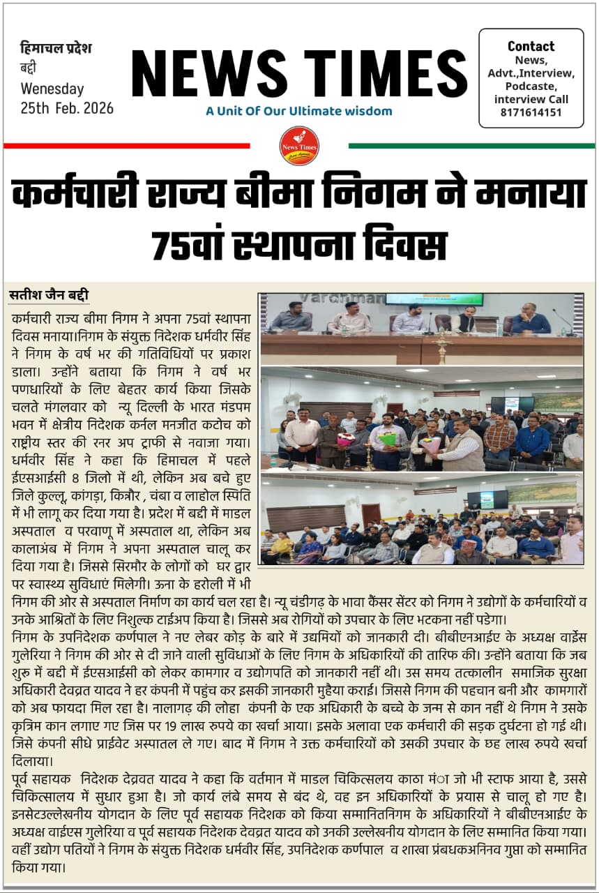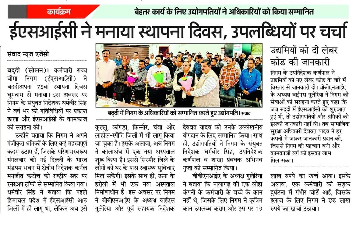 ESIC हिमाचल प्रदेश द्वारा मनाया गया 75 वां स्थापना दिवस