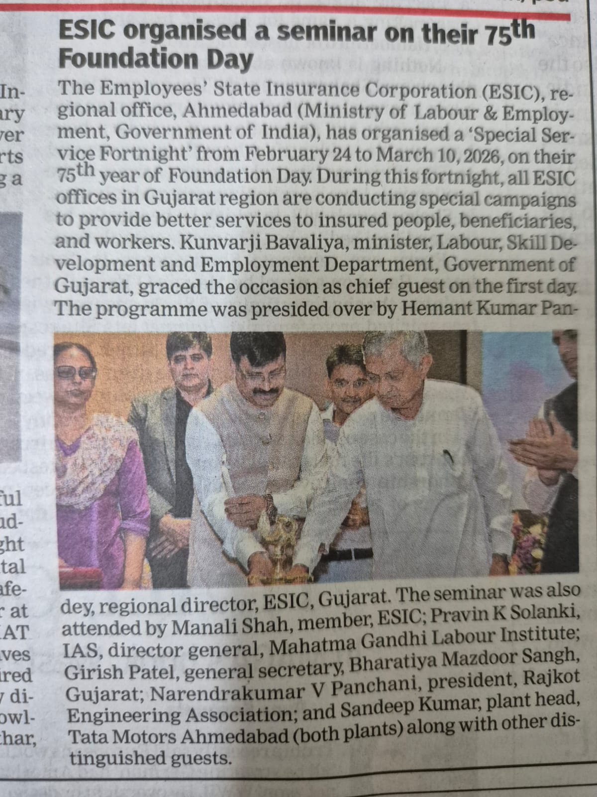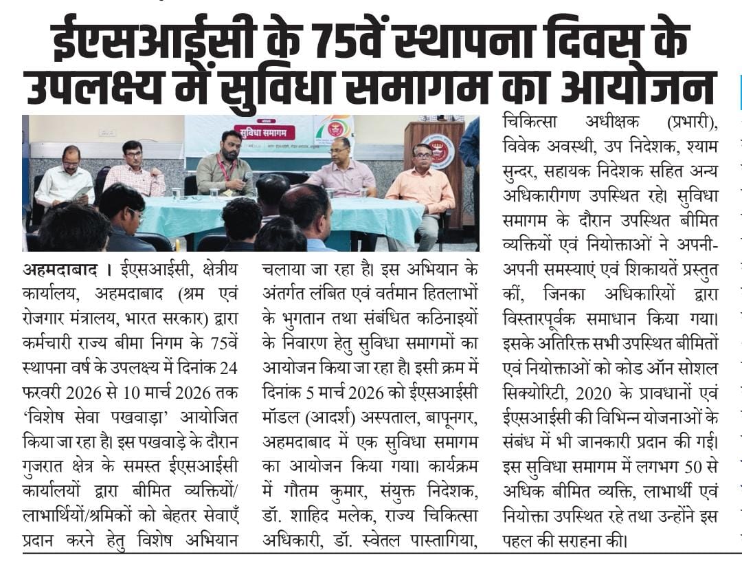 कर्मचारी राज्य बीमा निगम, अहमदाबाद द्वारा क.रा.बी. निगम के 75वें स्थापना दिवस के उपलक्ष्य में आयोजित गतिविधियों के संबंध में प्रेस नोट I size:()PDF IconPublish Date: 11/03/2026