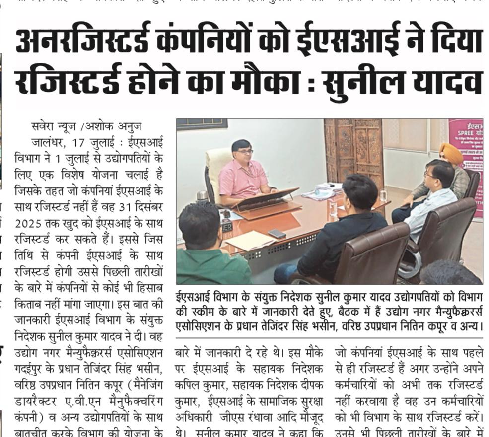 पंजाब केसरी -दिनांक 21.07.2025- ईएसआईसी ने सामाजिक सुरक्षा कवरेज विस्तार करने को नियोक्ताओ व कर्मचारियों के पंजीकरण को बढ़ावा देने की योजना SPREE 2025 शुरू की। size:()