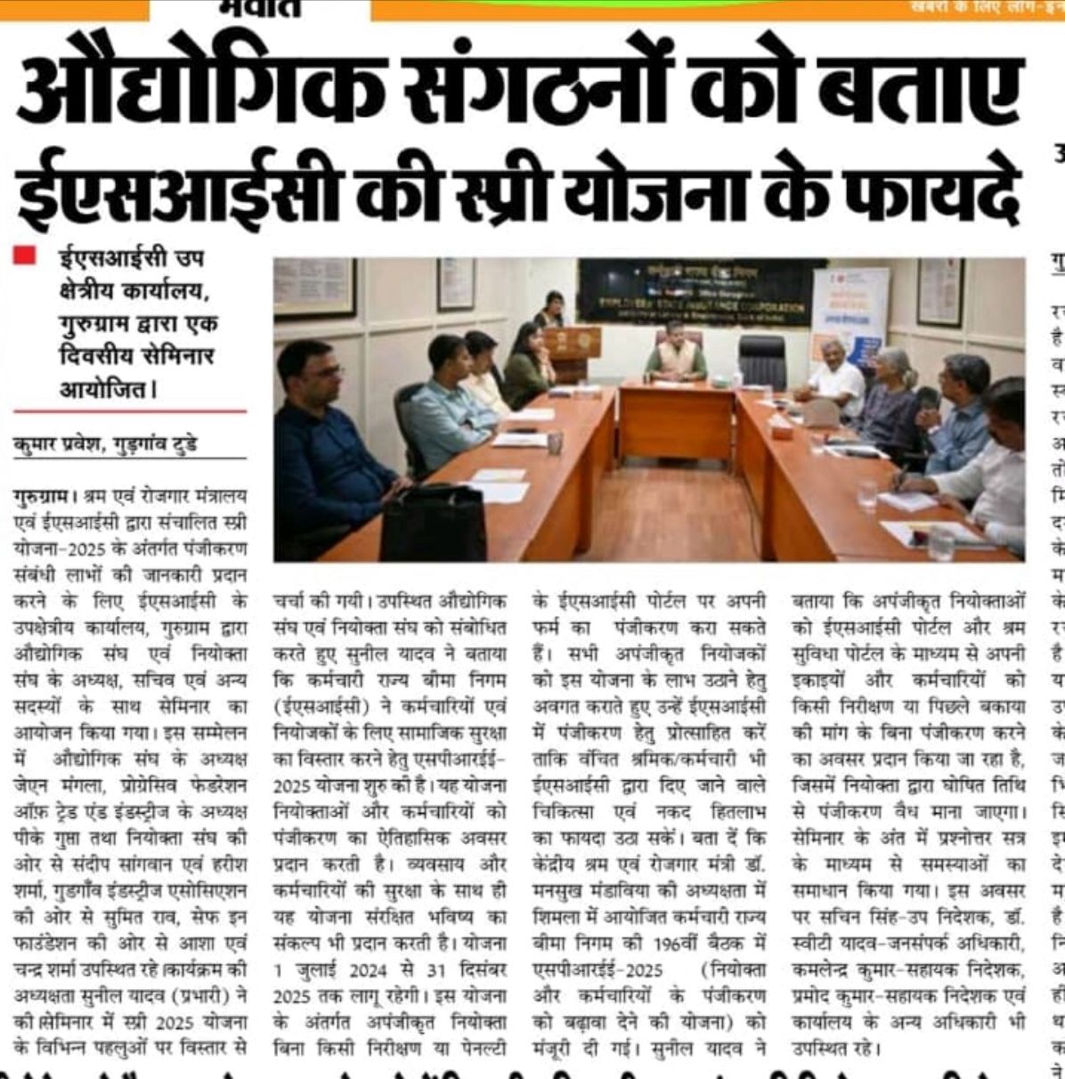 जगबानी -दिनांक 20.07.2025- ईएसआईसी ने सामाजिक सुरक्षा कवरेज विस्तार करने को नियोक्ताओ व कर्मचारियों के पंजीकरण को बढ़ावा देने की योजना SPREE 2025 शुरू की। size:()