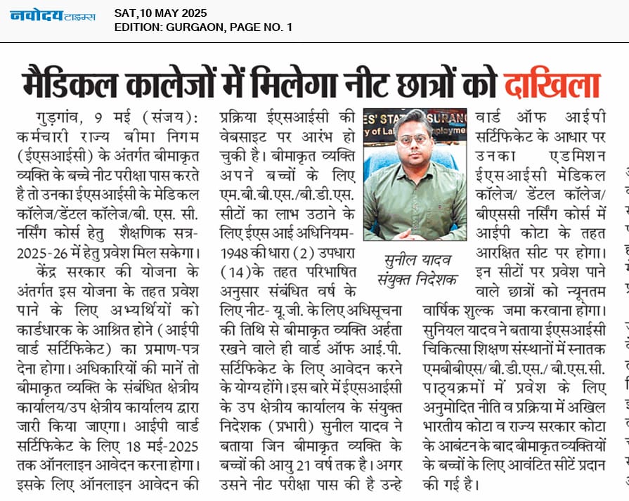 ई.एस.आई. के बीमित व्यक्तियों के बच्चों को मेडिकल की पढाई के लिए प्रमाणपत्र जारी करने हेतु ऑनलाइन आवेदन की तिथि 01.05.2025 से 18.05.2025 तक (Language- Hindi)) size:(666.70 KB)