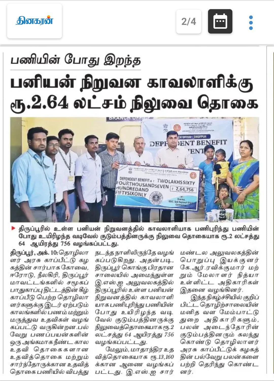 Dependent Benefit payment and Sanction order given to Dependents of DIP Vadivel by Shri. K R Ravikumar, Deputy Director in Charge, ESI Corporation, Sub Regional Office, Coimbatore - News Published in Dinakaran on 10.10.2024 size:(197.49 KB)