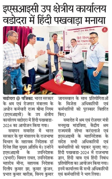 कर्मचारी राज्य बीमा निगम अस्पताल पीन्या मे दिनांक 30-09-2024 को राज्य भाषा पखवारा 2024 का समापन समारोह मनाया गया । इस दौरान आयोजित विभिन्न प्रतियोगिता के विजेताओ को भी पुरस्कृत किया गया। यह समाचार ‘ दक्षिण भारत रास्ट्रमत ‘ समाचार पत्र मे दिनांक 01-10-2024 को प्रकाशित किया गया । size:(167.45 KB)