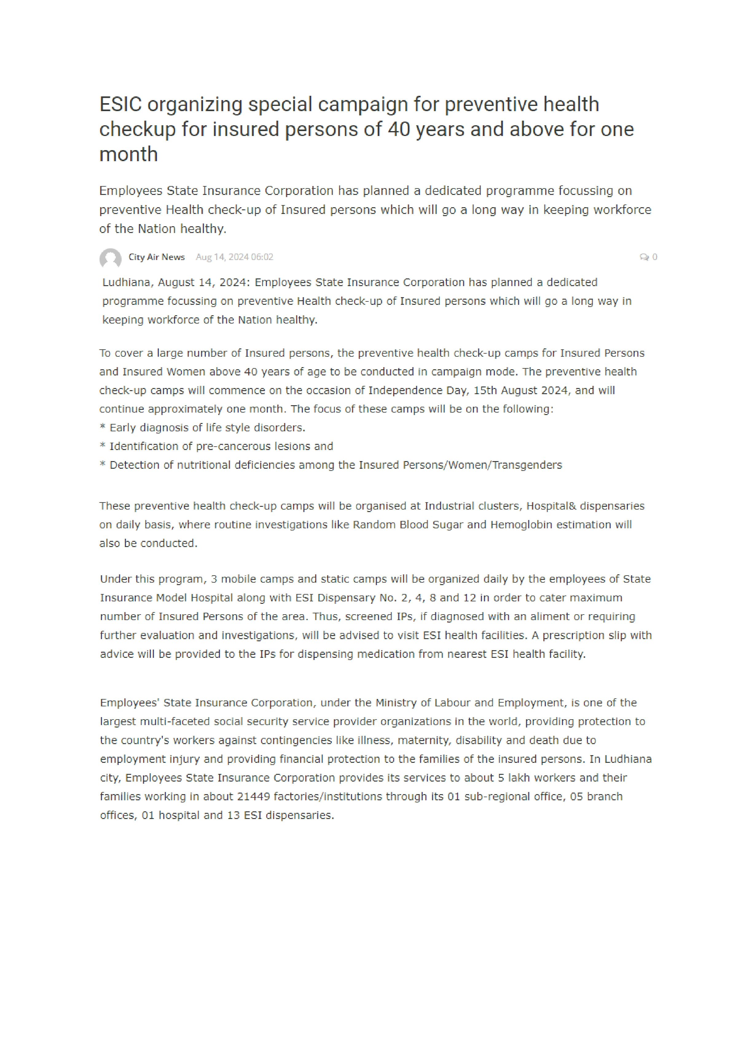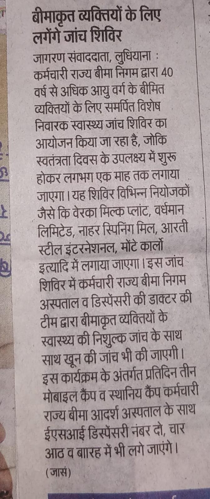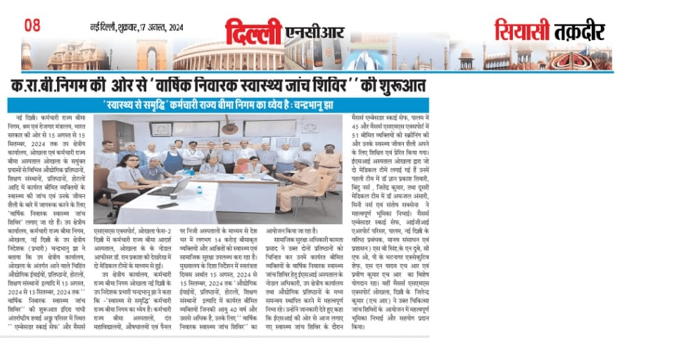 78वी वर्षगांठ के उपलक्ष में कर्मचारी राज्य बीमा निगम द्वारा 40 वर्ष से अधिक बीमाकृत व्यक्तियों के लिए लगाया जा रहा है “स्वास्थ्य जाँच शिविर” size:(97.59 KB)