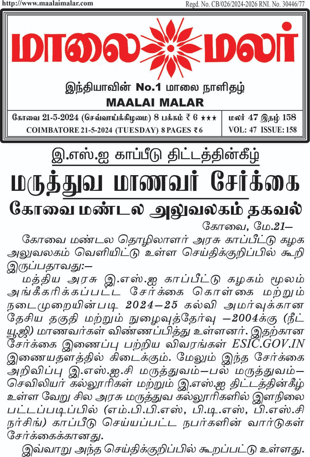 ESIC invites applications for MBBS seats under insured person quota News in Tamil size:()