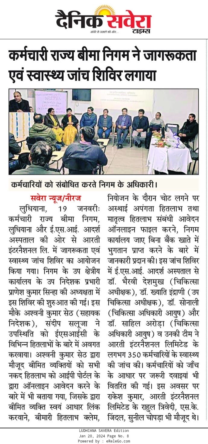 उप क्षेत्रीय कार्यालय, लुधियाना और ईएसआई आदर्श अस्पताल, लुधियाना द्वारा मिलकर मै. आरती इंटरनेशनल लिमिटेड, लुधियाना में एक जागरूकता एवं स्वास्थ्य जाँच शिविर का आयोजन किया गया। size:()