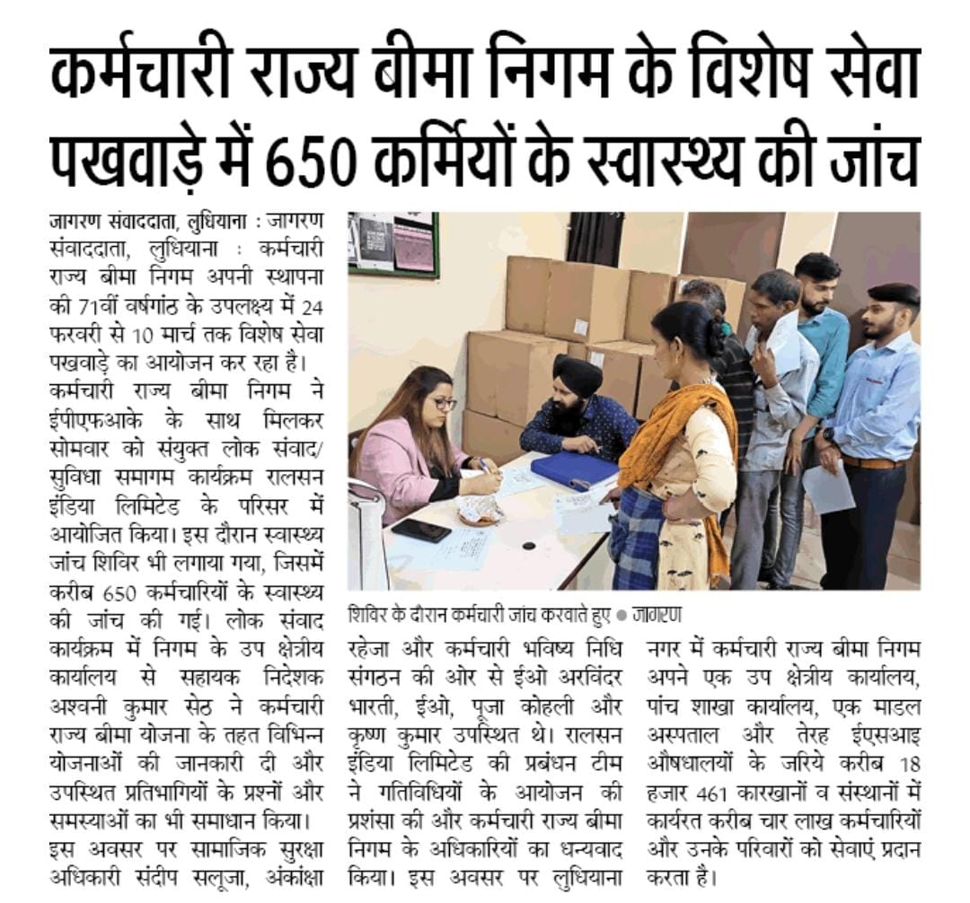 कर्मचारी राज्य बीमा निगम के विशेष सेवा पखवाड़े में 650 कर्मियों के स्वास्थ्य की जाँच की गई। size:()