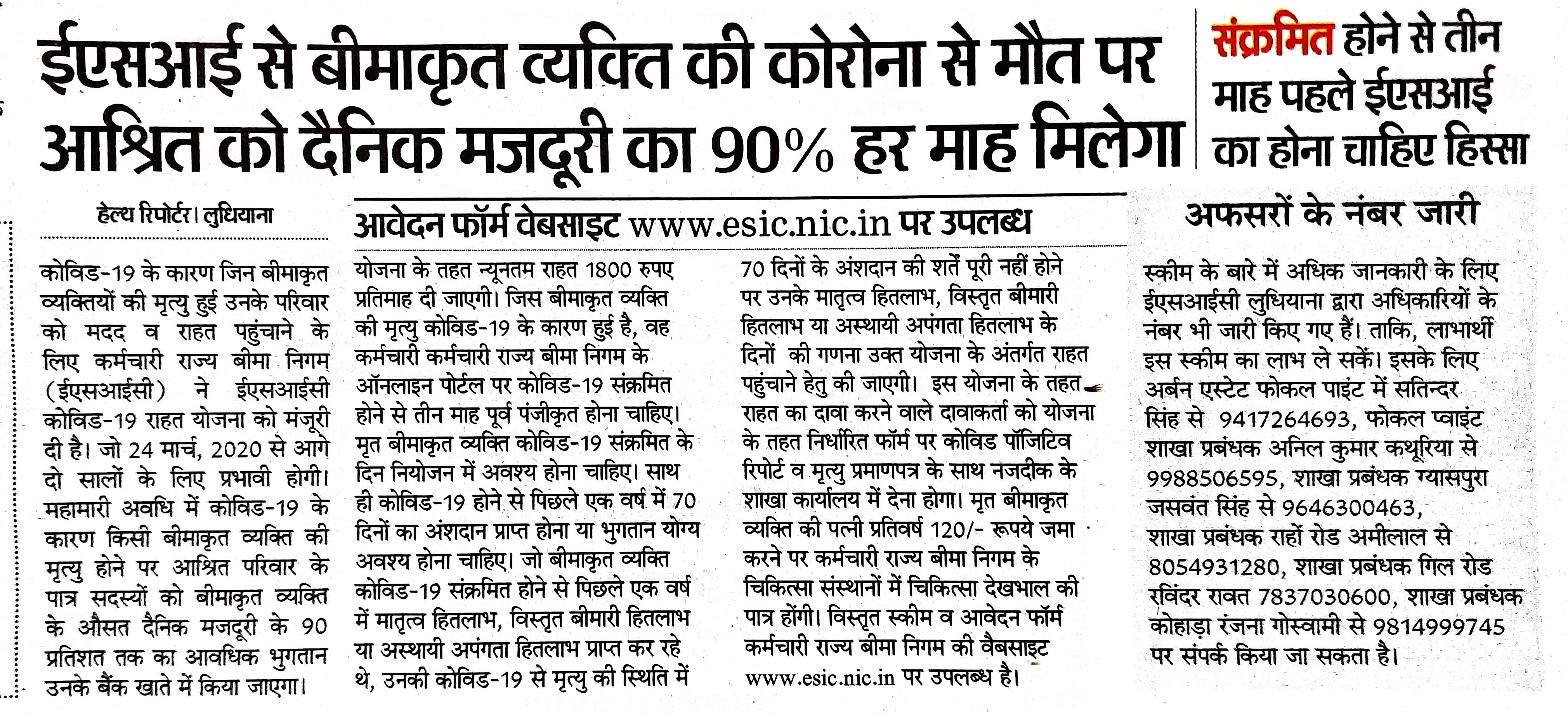 ईएसआई से बीमाकृत व्यक्ति की कोरोना से मौत पर आश्रित को दैनिक मजदूरी का 90 प्रतिशत हर माह मिलेगा। size:()