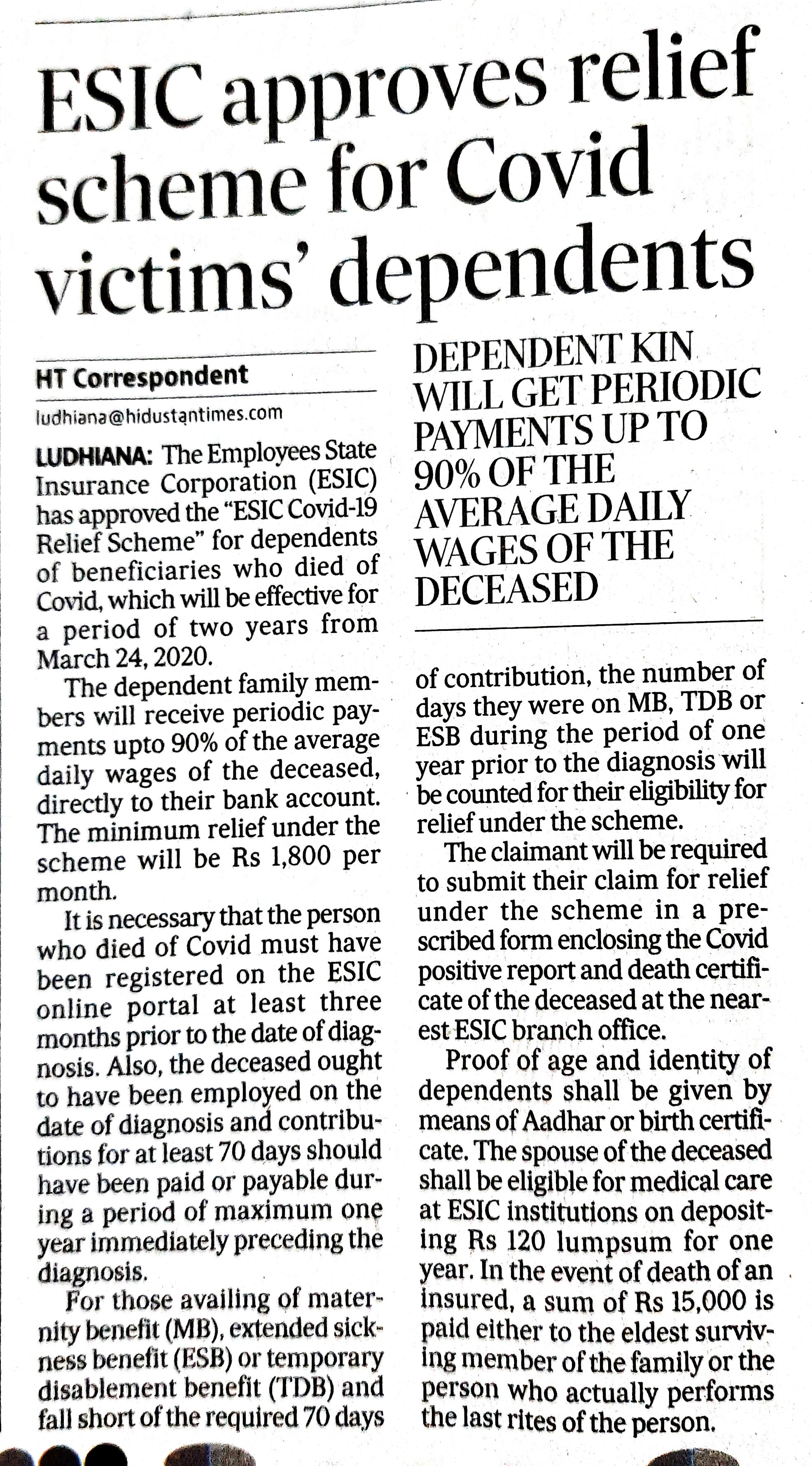 ESIC approves relief scheme for Covid victims dependents. size:(5.97 MB)