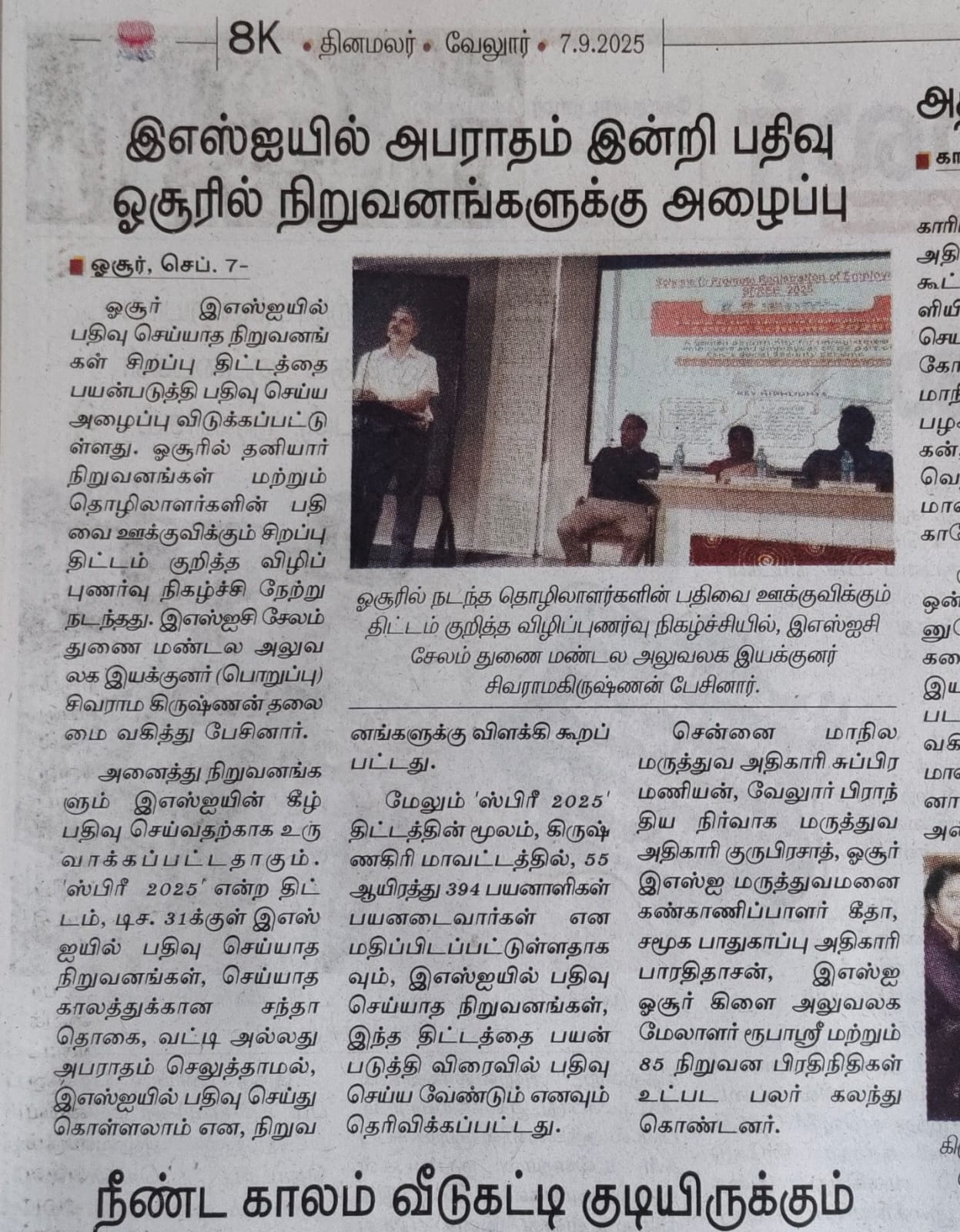 SPREE 2025 AWARENESS MEETING CONDUCTED AT M/S HOSUR INDUSTRIAL ASSOCIATION BUILDING ON 04.09.2025 ATTENDED BY S. SUBRAMANIAN, STATE MEDICAL OFFICER (SMO), RO CHENNAI, DR. GURUPRASADH, REGIONAL ADMINISTRATIVE MEDICAL OFFICER (RAMO), VELLORE, DR. GEETHA, MEDICAL SUPERINTENDENT, ESIS HOSPITAL, HOSUR AND 85 EMPLOYERS AND THEIR REPRESENTATIVES – NEWS PUBLISHED IN INDIAN EXPRESS ON 05.09.2025, THE HINDU ON 05.09.2025, KALAIKATHIR ON 06.09.2025 AND DINALAMALAR ON 07.09.2025. size:()